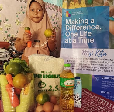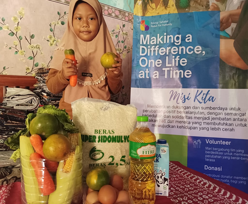 Foto : Dila menerima paket bahan makanan dengan senyum bahagia di wajahnya. Bantuan ini sangat berarti bagi keluarganya di tengah situasi yang sulit (Alubuky Sinergi Sahabat Peduli For Humanity)