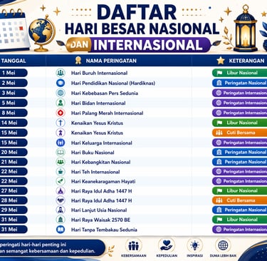 Hari besar nasional dan internasional merupakan momentum penting yang diperingati untuk mengenang berbagai peristiwa bersejarah, nilai-nilai kemanusiaan, serta perjuangan yang telah membentuk kehidupan bangsa dan dunia. Setiap tanggal peringatan membawa pesan dan makna yang berbeda, mencerminkan dinamika sejarah, budaya, sosial, hingga perkembangan global. Melalui peringatan ini, masyarakat diajak untuk tidak hanya mengingat, tetapi juga memahami dan mengambil pelajaran dari setiap peristiwa yang telah terjadi. Berikut daftar hari besar Nasional dan Internasioal di bulan Mei