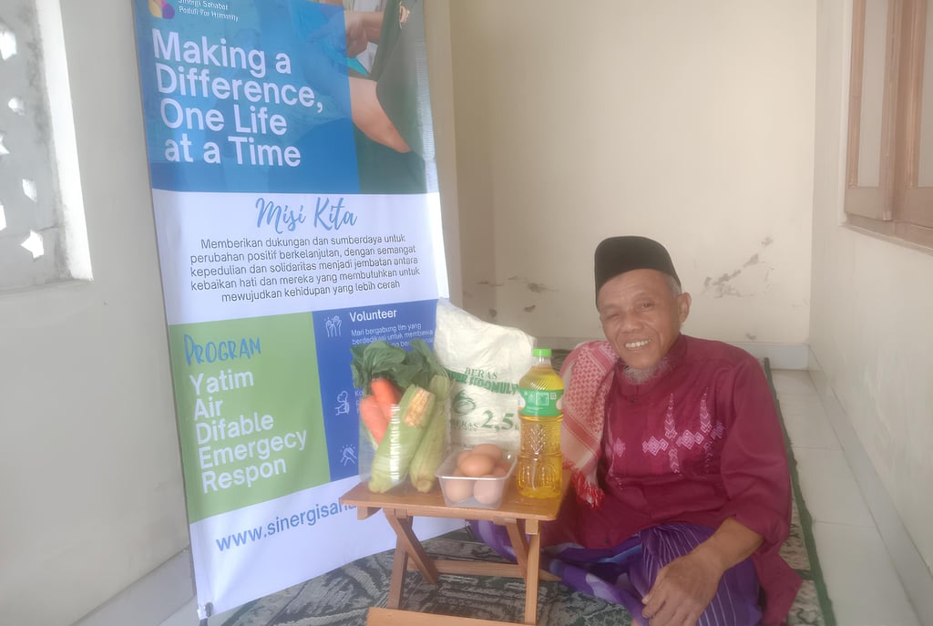Foto : Pak Widodo menerima paket sembako dengan penuh rasa syukur, sebagai bentuk dukungan di masa sulit. (Alubuky Sinergi Sahabat Peduli For Humanity)